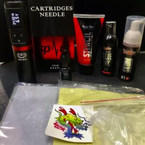 Kit de tattoo con maquina tipo pen poseidon, caja de cartuchos, campos esteril, un coban, dosbolsas de cups, una hoja de papel hectografico, marcador hectografico, plantilla y un par de guantes